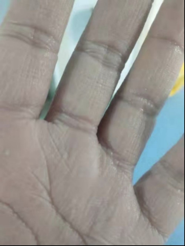 連續(xù)工作8小時,中國科大附一院(安徽省立醫(yī)院)援鄂醫(yī)療隊隊員樊華手掌被汗水泡皺。