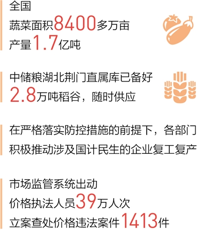 連日來(lái),各部門積極組織蔬菜等副食品生產(chǎn),確保蔬菜、肉蛋奶、糧食等居民生活必需品供應(yīng),加強(qiáng)統(tǒng)籌協(xié)調(diào),保障煤電油氣供應(yīng)。同時(shí),依法嚴(yán)厲打擊利用疫情哄抬物價(jià)、囤積居奇、趁火打劫等擾亂社會(huì)秩序的違法犯罪行為。目前,全國(guó)生活必需品市場(chǎng)供應(yīng)總體充足、價(jià)格穩(wěn)定。全國(guó)路網(wǎng)保障和運(yùn)行良好,物資運(yùn)輸整體有序。