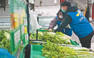 2月5日,在江蘇南京江寧區(qū)秣陵街道牛首社區(qū)一家超市,網(wǎng)格員陶慧(左)、王俊在幫助居家隔離的居民買菜。新華社記者 季春鵬攝