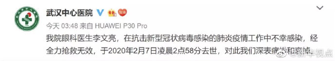 據(jù)@武漢中心醫(yī)院消息:武漢中心醫(yī)院眼科醫(yī)生李文亮,在抗擊新型冠狀病毒感染的肺炎疫情工作中不幸感染,經(jīng)全力搶救無效,于2020年2月7日凌晨2點58分去世,對此,醫(yī)院方面深表痛惜和哀悼。