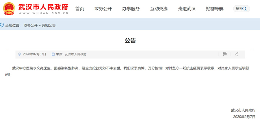 武漢中心醫(yī)院李文亮醫(yī)生,因感染新型肺炎,經(jīng)全力搶救無(wú)效不幸去世。我們深表哀悼,萬(wàn)分惋惜!對(duì)其堅(jiān)守一線抗擊疫情表示敬意,對(duì)其家人表示誠(chéng)摯慰問(wèn)!