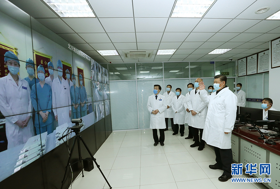 自今年1月12日起,首都醫(yī)科大學(xué)附屬北京地壇醫(yī)院開(kāi)始承擔(dān)新冠肺炎患者的救治、篩查、隔離工作,收治了北京市第一例確診病例。習(xí)近平來(lái)到地壇醫(yī)院門(mén)診樓一層運(yùn)行監(jiān)控中心,通過(guò)監(jiān)控畫(huà)面察看患者住院診療情況,并視頻連線正在病房值班的醫(yī)務(wù)人員,鼓勵(lì)他們繼續(xù)完善診療方案,繼續(xù)全力以赴救治患者,努力提高收治率和治愈率、降低感染率和病亡率,并叮囑他們做好自我防護(hù)。