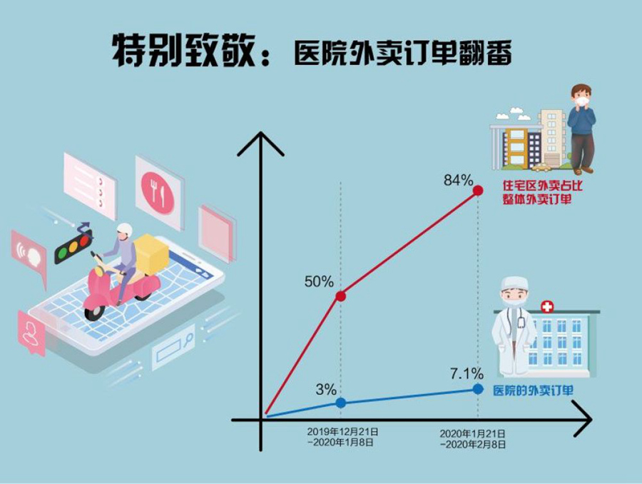 “餓了么”數(shù)據(jù)顯示,自疫情爆發(fā)以來,醫(yī)院的外賣訂單占比上升了一倍,加班加點,外賣訂單猛增,讓我們向戰(zhàn)斗在一線的醫(yī)務工作者致敬!