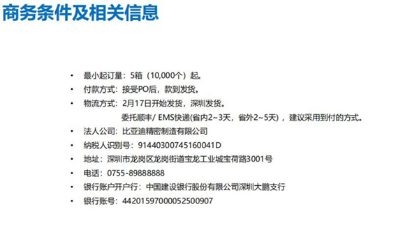 與此同時(shí),《比亞迪賣口罩了》pdf文件也在網(wǎng)上流傳,文件內(nèi)容顯示,口罩制造的法人公司為比亞迪精密制造有限公司,最小起訂量為5箱(10000個(gè))起,2月17日開始從深圳發(fā)貨??爝f委托順豐/ EMS快遞(省內(nèi)2-3天,省外2-5天) 。