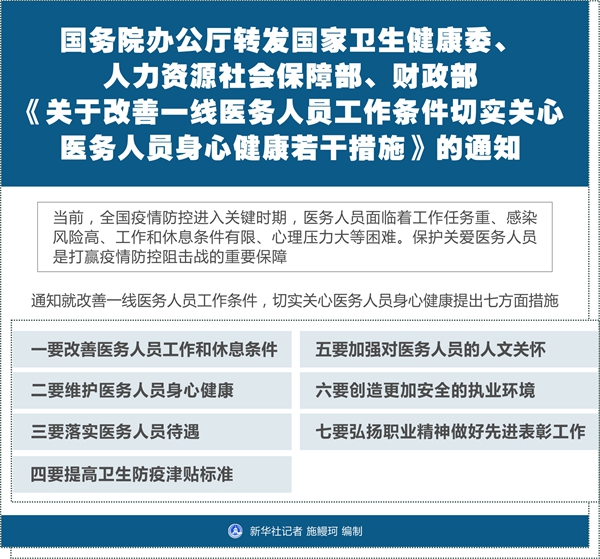 通知就改善一線醫(yī)務(wù)人員工作條件,切實關(guān)心醫(yī)務(wù)人員身心健康提出七方面措施。一要改善醫(yī)務(wù)人員工作和休息條件。加強醫(yī)務(wù)人員職業(yè)暴露的防護設(shè)施建設(shè)和設(shè)備配置,重點改造醫(yī)生辦公室、值班室和休息室。為醫(yī)務(wù)人員提供良好后勤服務(wù),保障醫(yī)務(wù)人員充足的睡眠和飲食。二要維護醫(yī)務(wù)人員身心健康。合理安排醫(yī)務(wù)人員作息時間。對于因執(zhí)行疫情防控不能休假的醫(yī)務(wù)人員,在防控任務(wù)結(jié)束后,由所在醫(yī)療衛(wèi)生機構(gòu)優(yōu)先安排補休。允許需要緊急補充醫(yī)護人員等疫情防控工作人員的相關(guān)醫(yī)療衛(wèi)生機構(gòu)簡化招聘程序。加強醫(yī)務(wù)人員個人防護,組織做好一線醫(yī)務(wù)人員健康體檢,最大限度減少院內(nèi)感染。加強心理危機干預和心理疏導,減輕醫(yī)務(wù)人員心理壓力。三要落實醫(yī)務(wù)人員待遇。為疫情防控一線醫(yī)務(wù)人員和防疫工作者發(fā)放臨時性工作補助。向防控任務(wù)重、風險程度高的醫(yī)療衛(wèi)生機構(gòu)核增不納入基數(shù)的一次性績效工資總量。開通醫(yī)務(wù)人員工傷認定綠色通道。四要提高衛(wèi)生防疫津貼標準。出臺提高衛(wèi)生防疫津貼標準的政策。對參與新冠肺炎疫情防疫人員,要及時足額發(fā)放到位。五要加強對醫(yī)務(wù)人員的人文關(guān)懷。動員組織社會力量,對一線醫(yī)務(wù)人員展開慰問。為一線醫(yī)務(wù)人員和家屬建立溝通聯(lián)絡(luò)渠道。對家庭困難的一線醫(yī)務(wù)人員家屬進行對口幫扶。六要創(chuàng)造更加安全的執(zhí)業(yè)環(huán)境。嚴格落實各項安全防范措施,加大警力投入,完善問責機制,對發(fā)現(xiàn)有歧視孤立一線醫(yī)務(wù)人員及其家屬行為的,要及時進行批評教育,情節(jié)嚴重的依法予以處理。對傷害醫(yī)務(wù)人員的,要堅決依法嚴肅查處。七要弘揚職業(yè)精神做好先進表彰工作。做好及時獎勵和及時性表彰工作,為做好疫情防控工作增強信心、凝聚力量。