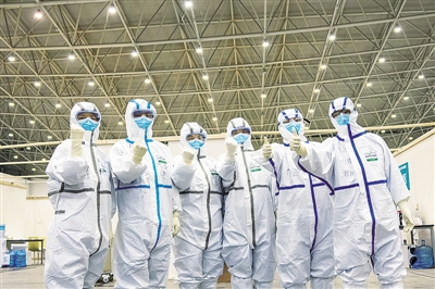 2月10日,在武漢客廳方艙醫(yī)院,幾名醫(yī)護人員為自己打氣。新華社記者 熊琦攝