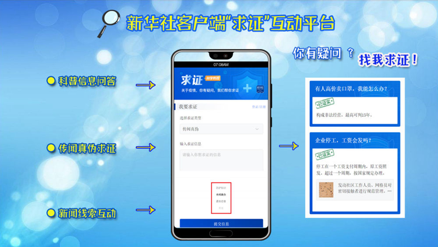 新華社北京2月12日電(記者 程昊)“新型冠狀病毒來襲,哪些人容易中招?”“聽說我們小區(qū)馬上就要全封閉了,是真的嗎?”……面對(duì)大量信息,不少網(wǎng)友感覺真假難辨,期待解答。新華社客戶端今日推出“求證”互動(dòng)平臺(tái),旨在架起網(wǎng)民和權(quán)威機(jī)構(gòu)間的橋梁,傳遞權(quán)威信息,回應(yīng)網(wǎng)友關(guān)切,幫助網(wǎng)友在疫情防控期間獲取真實(shí)有效的信息和科普知識(shí),去偽存真,解疑釋惑。