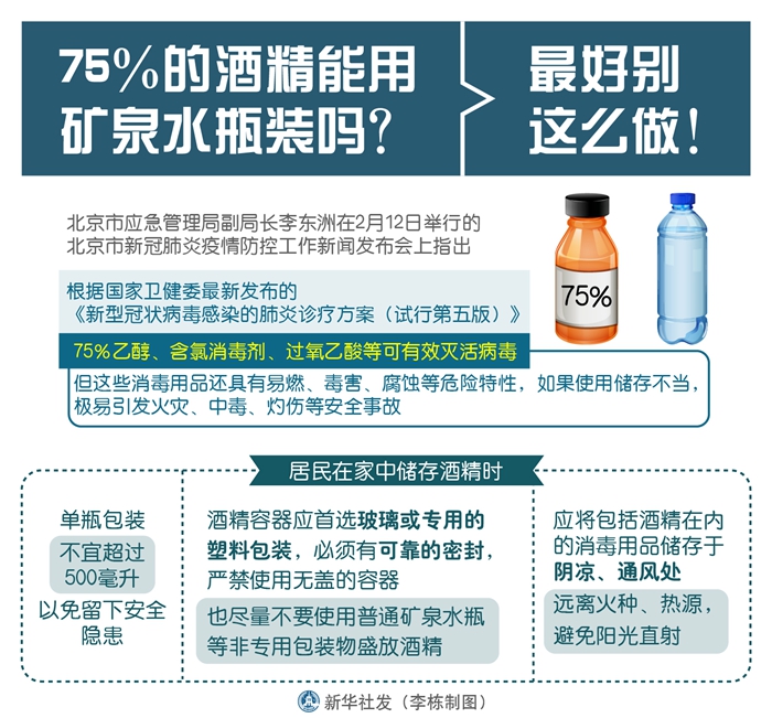 新華社北京2月13日電(記者丁靜)越來越多的人選擇常備75%的乙醇(俗稱酒精)進行家庭和個人消毒。那么,75%的乙醇可以裝在礦泉水瓶里嗎?北京市應急管理局副局長李東洲在12日舉行的北京市新冠肺炎疫情防控工作新聞發(fā)布會上稱,最好別這么做。