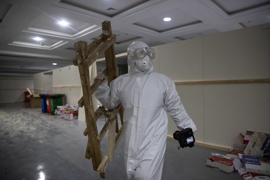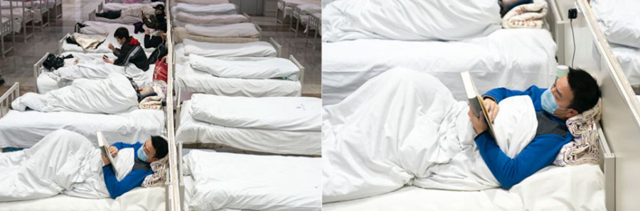 這些身影中還有被隔離的病人。江漢方艙醫(yī)院?jiǎn)⒂玫牡谝惶?,收治的首批病人里,有一個(gè)面目清秀的小伙子。入院躺下后,他打開了一本《政治秩序的起源》,安靜地閱讀??谡终谧×怂谋砬?,但卻藏不住眼神里的平靜和專注。看見我舉起相機(jī),他輕輕擺了擺手,示意不用拍他,我猶豫片刻,還是執(zhí)意按下了快門。也許他并不明白,在有些喧囂的方艙醫(yī)院里,近乎靜止的他,是多么的令人震撼。