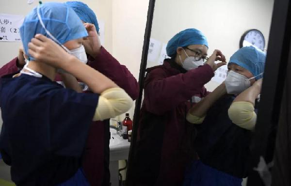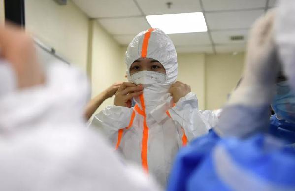武漢協(xié)和醫(yī)院(西院),湘雅醫(yī)院感染病科醫(yī)生在穿防護(hù)衣。經(jīng)濟(jì)日報記者高興貴攝