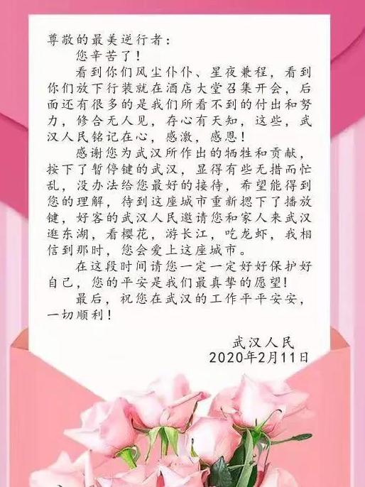 不久,華山醫(yī)院醫(yī)療隊(duì)回復(fù)道:這次,武漢人民需要幫助,我們責(zé)無(wú)旁貸地來(lái)了,來(lái)幫上一把!大家齊心協(xié)力,共渡難關(guān)。期待春暖花開(kāi),一起逛東湖、看櫻花、游長(zhǎng)江、吃龍蝦!