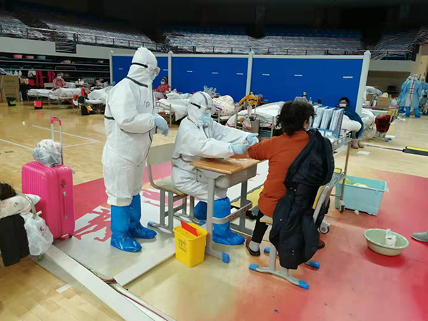 漢江方艙醫(yī)院內(nèi),醫(yī)護(hù)人員為患者做檢查。