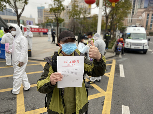 2月11日,在方艙治療5天后,許峰等來了期待已久的好消息:胸部CT檢測合格,兩次核酸檢測陰性。經(jīng)湘雅二醫(yī)院和湖北省腫瘤醫(yī)院專家團隊評估后,許峰有幸成為了第一批從武昌方艙醫(yī)院出艙的28名患者之一。