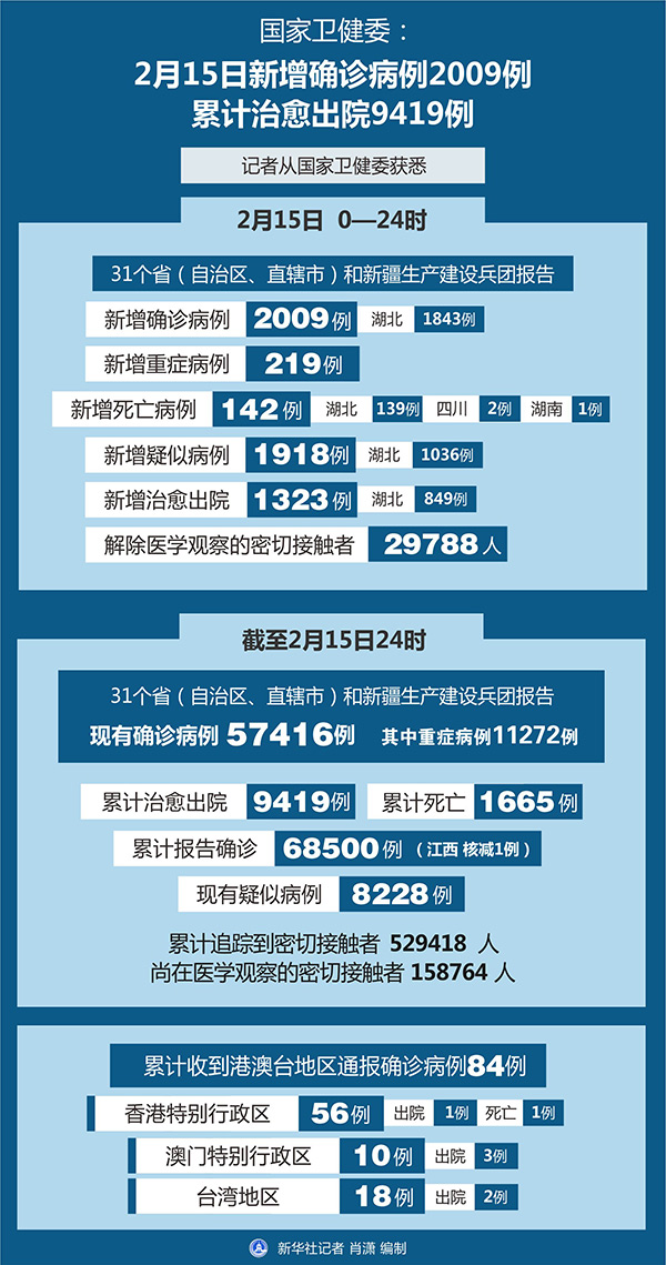 新華社北京2月16日電(記者安蓓、熊豐)記者16日從國家衛(wèi)生健康委員會了解到,2月15日0—24時,31個?。ㄗ灾螀^(qū)、直轄市)和新疆生產(chǎn)建設(shè)兵團(tuán)報(bào)告新增確診病例2009例,新增重癥病例219例,新增死亡病例142例(湖北139例,四川2例,湖南1例),新增疑似病例1918例。