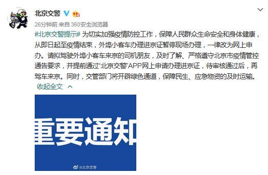 警方提醒,請擬駕駛外埠小客車來京的司機(jī)朋友,及時了解、嚴(yán)格遵守北京市疫情管控通告要求,并提前通過“北京交警”APP網(wǎng)上申請辦理進(jìn)京證,待審核通過后,再駕車來京。同時,交管部門將開辟綠色通道,保障民生、應(yīng)急物資的及時運(yùn)輸。