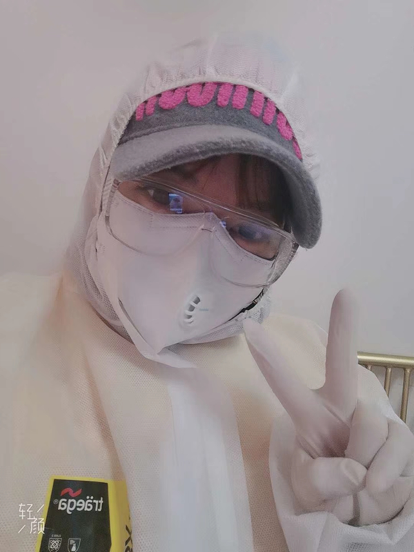 我出去心理壓力也很大,所以我回來進(jìn)門之前,消毒工作從頭到腳,到鞋底都不放過。防護(hù)服那些在樓下脫下,拿個(gè)塑料袋裝起來丟到垃圾桶。站在門外噴消毒液,我老公拿著“槍”對著我噴,感覺我的呼吸道都被消毒了。