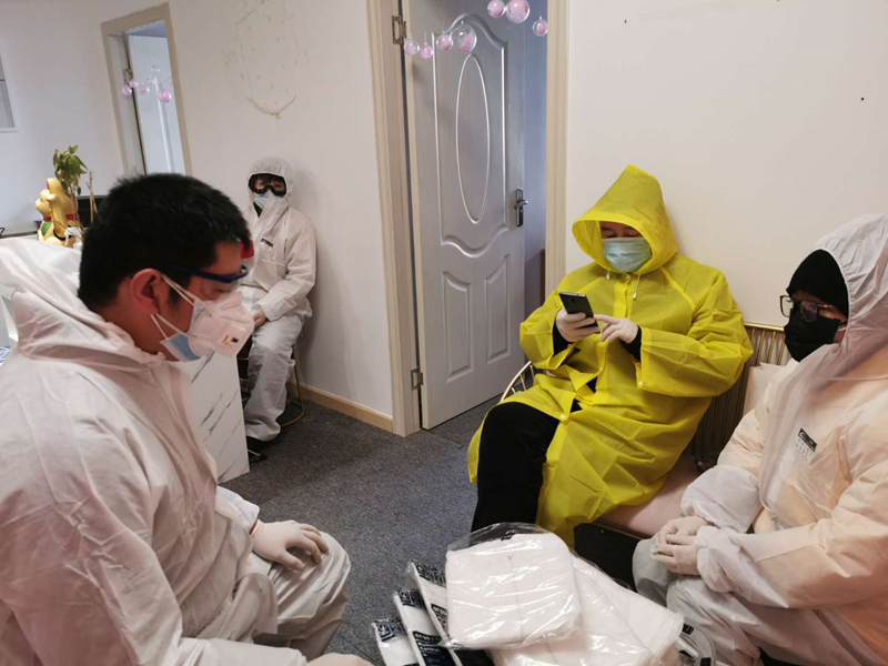 中午有別人贈(zèng)送給我們的面包、牛奶、方便面,我們躲在一個(gè)房間湊合著弄一下,要不就不吃,能堅(jiān)持就不吃。一天吃不了什么東西,而且又戴著口罩、穿著防護(hù)服。最后累得不想說話,坐著,發(fā)個(gè)呆,休息一會(huì)兒,然后再回家。