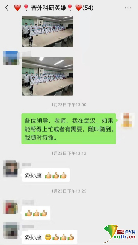 1月23日,看著老師奮戰(zhàn)在抗疫一線,他便主動(dòng)請(qǐng)求上“戰(zhàn)場(chǎng)”。不過,由于他的專業(yè)是外科,因此未被選中。1月24日,孫康在工作群里又得到通知,“醫(yī)院可能抽組醫(yī)療隊(duì)支援地方,進(jìn)行報(bào)名登記”。他便立即二次“請(qǐng)戰(zhàn)”。