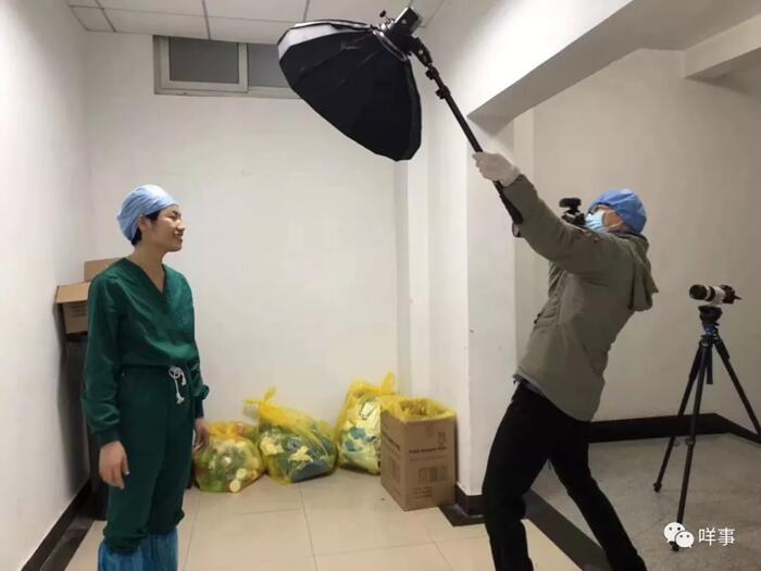 鐘銳鈞說,在拍攝的兩天內(nèi),他一直守在漢口醫(yī)院的隔離區(qū)外,等到醫(yī)護人員出門便走上前去,讓每個人只停留一分鐘,一手舉燈一手持相機完成拍攝。
