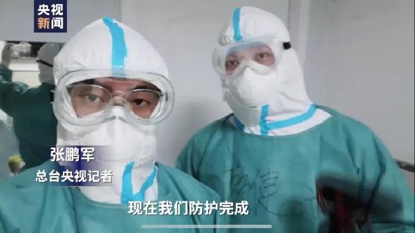 中央廣播電視總臺(tái)記者張鵬軍、賴健進(jìn)入武漢市漢口醫(yī)院隔離區(qū)采訪。