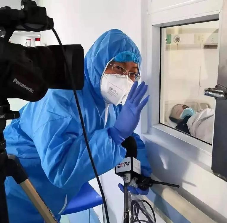 中央廣播電視總臺(tái)記者蔣曉平在武漢市金銀潭醫(yī)院采訪。