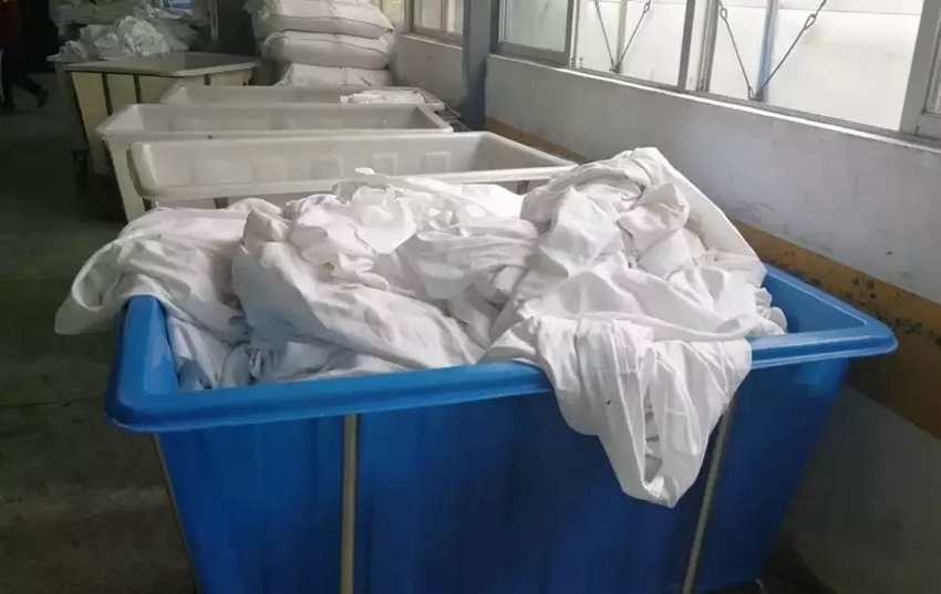 每趟列車到達終點站后,臥具都會重新更換,拆卸下的臥具由專人運送至洗滌消毒中心。被套、枕套、床單等分別放在不同的待洗推車里,工作人員會根據(jù)臥具的種類、污漬程度進行分揀。