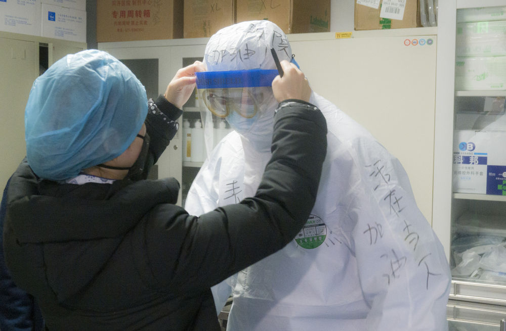 兩位醫(yī)護(hù)人員按照標(biāo)準(zhǔn)流程為即將進(jìn)入病區(qū)的同事穿戴防護(hù)服。