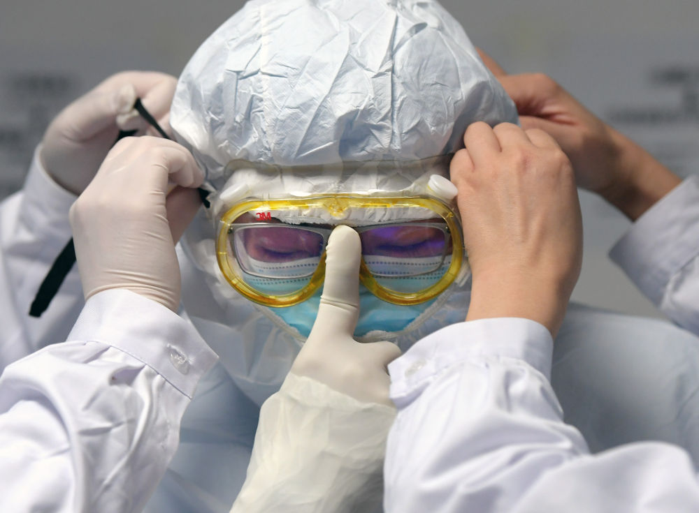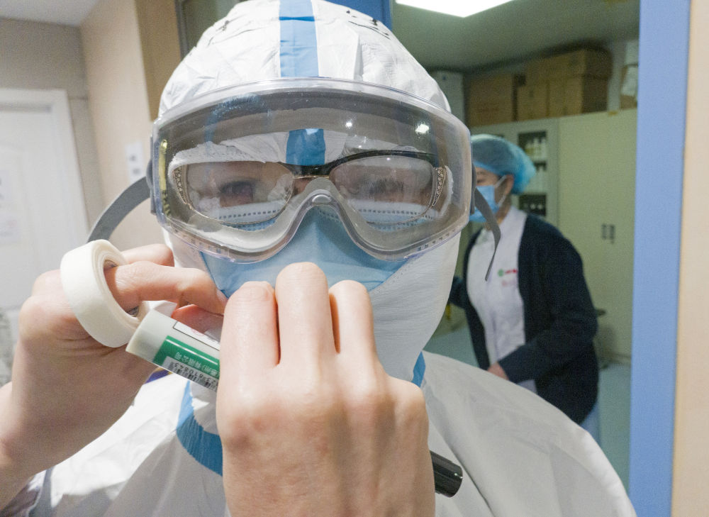 一名醫(yī)護(hù)人員戴好護(hù)目鏡后,用膠布再封一層增加氣密性。