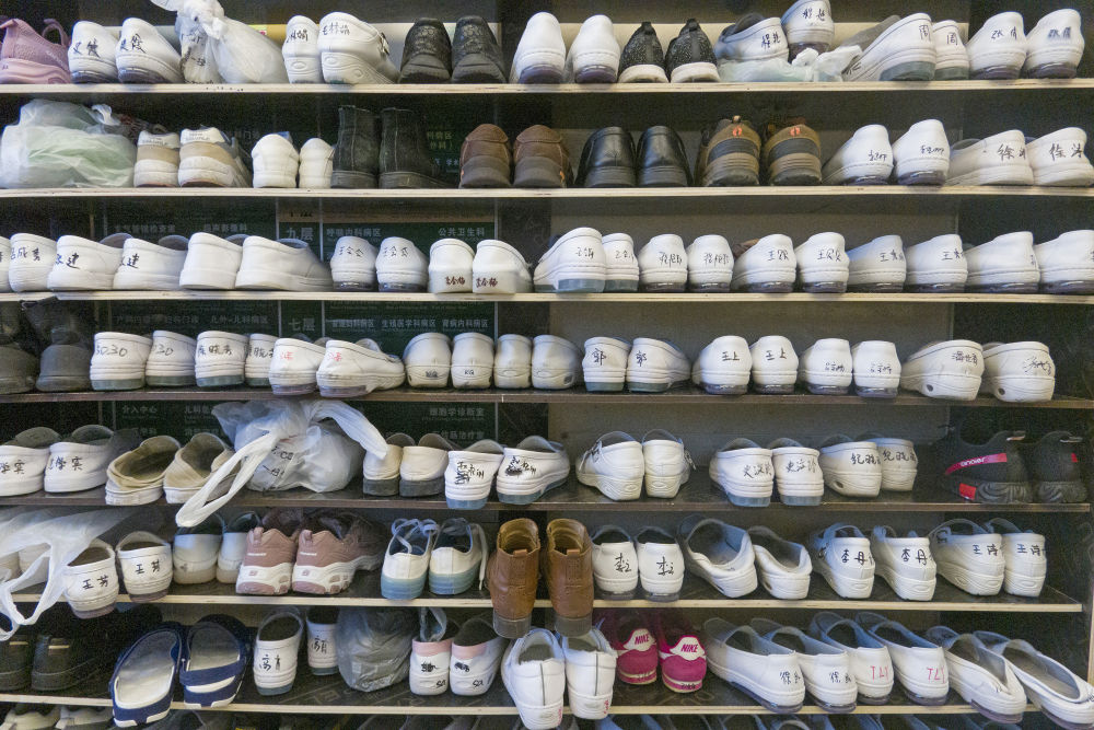 醫(yī)務(wù)人員按規(guī)定將鞋整齊有序地?cái)[放在工作間外。