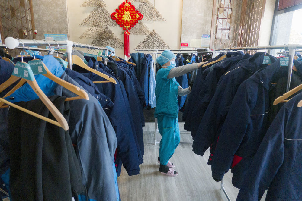 2月20日,回到酒店駐地的醫(yī)務(wù)人員按照生活駐地管理流程將外衣進(jìn)行統(tǒng)一保管。