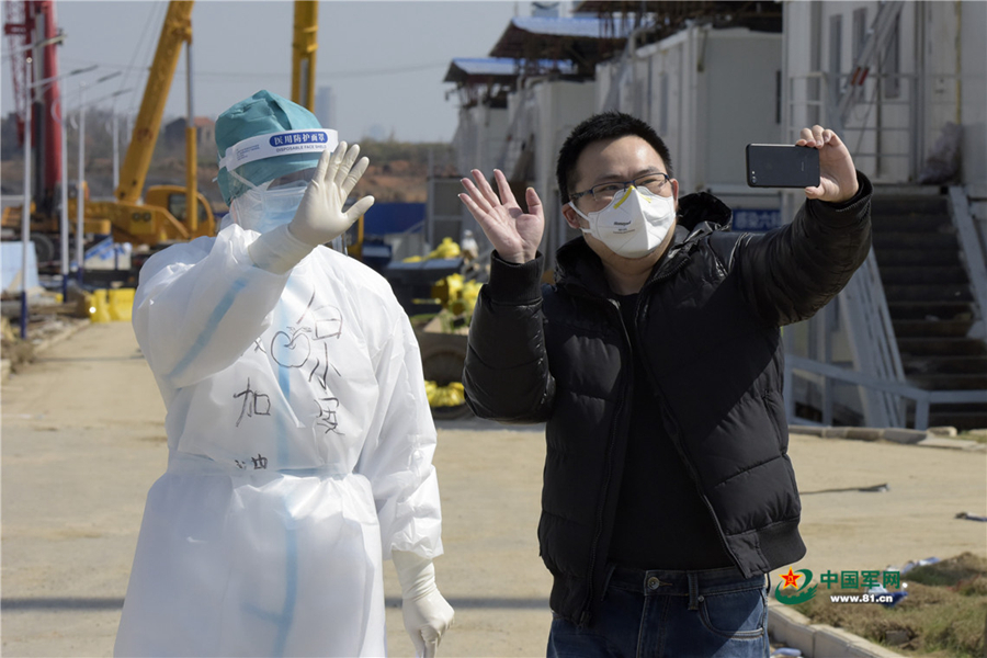 2月20日,治愈出院的萬先生錄制在火神山醫(yī)院的最后一條短視頻。中國軍網(wǎng)記者范顯海 攝