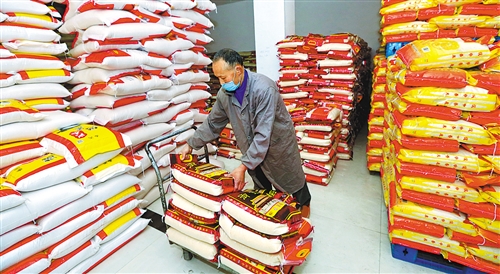 2月18日,四川建國順發(fā)商貿(mào)有限公司工人在搬卸大米。連日來,該公司每天加班加點為各大超市供應大米。鐘 敏攝(中經(jīng)視覺)