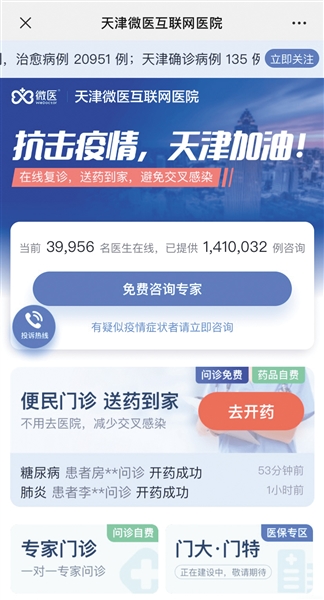 除針對新冠肺炎的免費(fèi)義診之外,圍繞慢性病和常見病的便民門診、心理援助專區(qū)和醫(yī)護(hù)人員心理關(guān)懷通道也快速開通,天津微醫(yī)互聯(lián)網(wǎng)醫(yī)院率先成為天津抗擊疫情的“第二戰(zhàn)場”。
