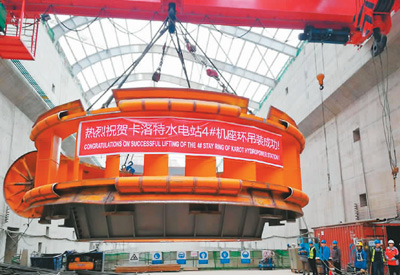 “中巴經濟走廊”優(yōu)先實施項目巴基斯坦卡洛特水電站最后一套座環(huán)、基礎環(huán)成功吊裝。三峽集團供圖