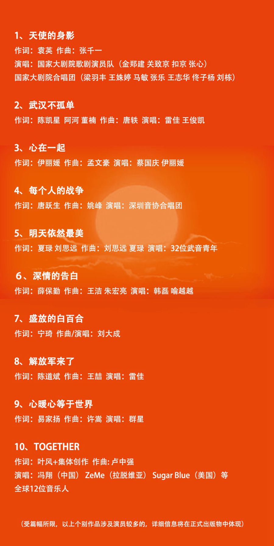目前,第二批入選作品即將與聽眾見面。此次精選的10首抗疫優(yōu)秀主題歌曲,凝結(jié)社會各界的創(chuàng)作力量,包括各地音樂工作者、音樂院校、藝術(shù)院團、專業(yè)音樂公司等,主要表現(xiàn)疫情防控工作進入關(guān)鍵階段以來,全國上下一盤棋,眾志成城決戰(zhàn)決勝武漢抗疫保衛(wèi)戰(zhàn)的堅定決心和必勝信念。