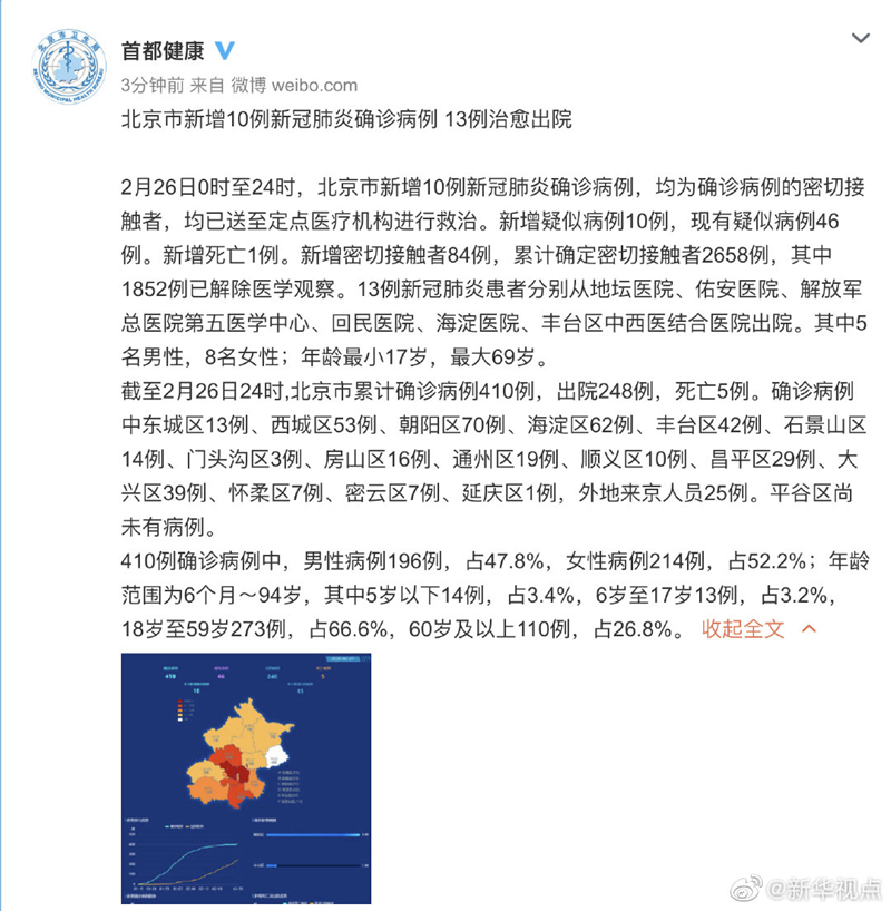 2月26日0時至24時,北京市新增10例新冠肺炎確診病例,均為確診病例的密切接觸者,均已送至定點醫(yī)療機構(gòu)進行救治。新增疑似病例10例,現(xiàn)有疑似病例46例。新增死亡1例。新增密切接觸者84例,累計確定密切接觸者2658例,其中1852例已解除醫(yī)學(xué)觀察。13例新冠肺炎患者分別從地壇醫(yī)院、佑安醫(yī)院、解放軍總醫(yī)院第五醫(yī)學(xué)中心、回民醫(yī)院、海淀醫(yī)院、豐臺區(qū)中西醫(yī)結(jié)合醫(yī)院出院。其中5名男性,8名女性;年齡最小17歲,最大69歲。