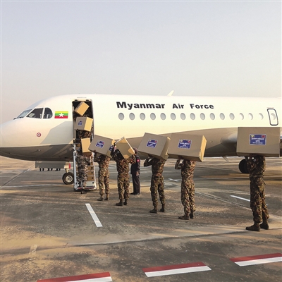 2月25日清晨迎著朝陽,緬甸國防軍使用空軍飛機(jī)運(yùn)送N95級(jí)別口罩、護(hù)目鏡、防護(hù)服等醫(yī)療捐助物資前往中國,旨在幫助中國抗擊新冠肺炎疫情,緬甸國防軍總參謀長妙通烏上將、駐緬甸大使陳海、使館武官熊韶?zé)樀仍趦?nèi)比都機(jī)場送行。光明日?qǐng)?bào)駐仰光記者鹿鋮攝/光明圖片