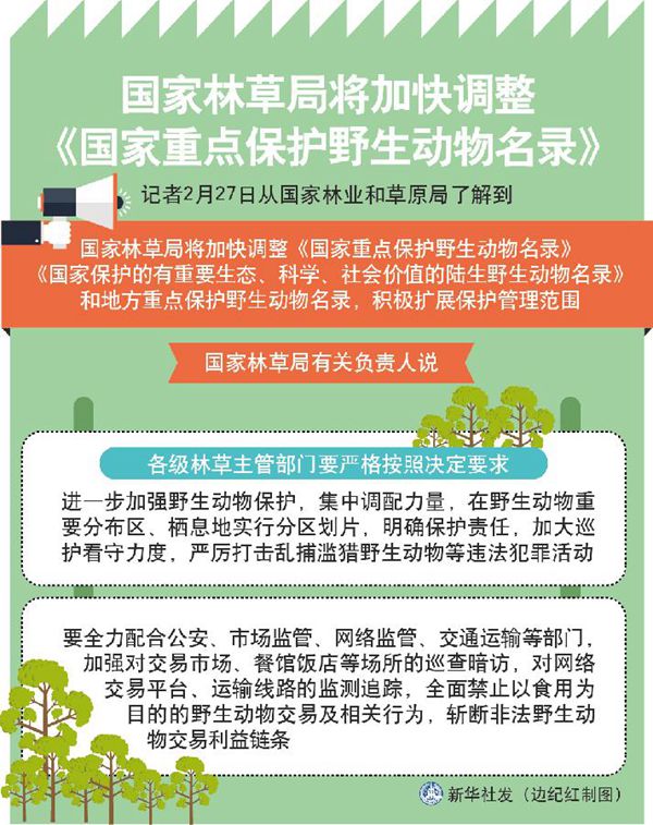 新華社北京2月27日電(記者胡璐)記者27日從國家林業(yè)和草原局了解到,國家林草局將加快調(diào)整《國家重點保護野生動物名錄》《國家保護的有重要生態(tài)、科學、社會價值的陸生野生動物名錄》和地方重點保護野生動物名錄,積極擴展保護管理范圍。