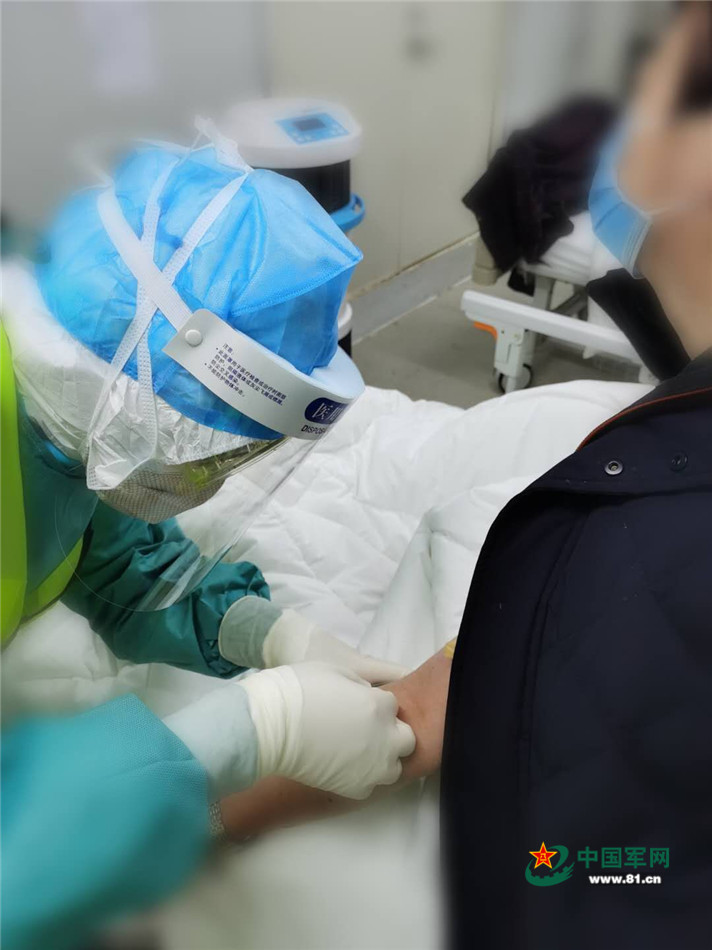 今天的主要任務(wù)是給18名病人抽血。這項(xiàng)平時(shí)對我來說簡單的不能再簡單的任務(wù),此刻卻充滿了挑戰(zhàn)性??谡帧⒚弊?、手套、防護(hù)服、護(hù)目鏡、防護(hù)面屏都給抽血帶來了極大的困難,呼出的熱氣讓護(hù)目鏡變得模糊,昏暗的燈光讓本就有限的視線變得更加不足,三層防護(hù)手套讓抽血也變得毫無手感。在抽血過程中,一個(gè)大媽問道:“姑娘,你們是來自部隊(duì)的么?”我看著她那親切的眼神,笑著點(diǎn)了點(diǎn)頭。大媽露出了信任的微笑,“有你們在,我就放心了。”這句話讓我的內(nèi)心久久不能平靜。