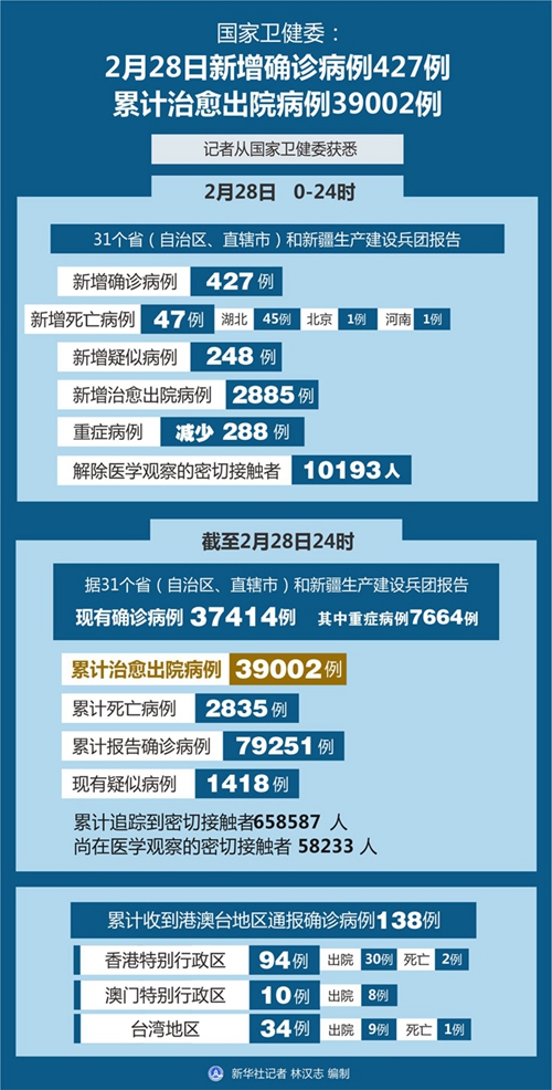 截至2月28日24時,據(jù)31個?。ㄗ灾螀^(qū)、直轄市)和新疆生產(chǎn)建設(shè)兵團(tuán)報告,現(xiàn)有確診病例37414例(其中重癥病例7664例),累計(jì)治愈出院病例39002例,累計(jì)死亡病例2835例,累計(jì)報告確診病例79251例,現(xiàn)有疑似病例1418例。累計(jì)追蹤到密切接觸者658587人,尚在醫(yī)學(xué)觀察的密切接觸者58233人。