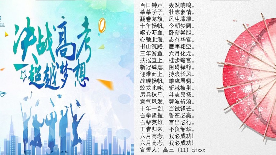 高三學(xué)生劉晨曦:“下午4點(diǎn)到4點(diǎn)50分,我們利用班會(huì)課開(kāi)展了誓師大會(huì),由于技術(shù)的原因,我們是通過(guò)放PPT視頻以及開(kāi)語(yǔ)音的方式來(lái)開(kāi)展的。(環(huán)節(jié))最開(kāi)始是我們班主任講話?!?/p>