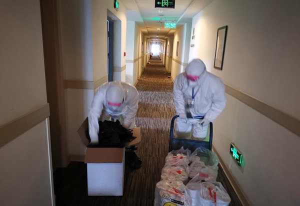 走馬嶺“康復(fù)驛站”負(fù)責(zé)人、走馬嶺街工委副書(shū)記陶勇介紹,目前整個(gè)東西湖區(qū)共有5家“康復(fù)驛站”。由于走馬嶺“康復(fù)驛站”此前作為兩次檢測(cè)轉(zhuǎn)陰患者的“待出院隔離觀察點(diǎn)”,所以酒店已經(jīng)按照“三區(qū)兩通道”要求進(jìn)行了改造。昨天入住的出院患者來(lái)自各個(gè)醫(yī)院,包括火神山醫(yī)院、東西湖區(qū)人民醫(yī)院、兒童醫(yī)院以及各個(gè)方艙醫(yī)院,由區(qū)里和街道調(diào)配車(chē)輛完成轉(zhuǎn)運(yùn)。陶勇說(shuō):“因?yàn)檫@里最開(kāi)始作為‘雙陰’的一個(gè)待出院隔離點(diǎn),所以就按照‘三區(qū)兩通道’的格局來(lái)制定。一個(gè)是病人的通道,另一個(gè)是醫(yī)生的通道,病人走了以后,我們進(jìn)行殺毒、登記,然后安排到酒店的房間。我們旁邊也征用了一個(gè)別人的公司,在上面打通了一個(gè)連接酒店那邊的通道?!?/p>
