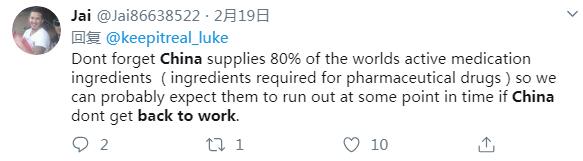 推特用戶Jai說:不要忘了中國供應(yīng)著全世界80%的活性藥物成分,因此如果中國不復(fù)工復(fù)產(chǎn),它們可能會在某個(gè)時(shí)間點(diǎn)用完。