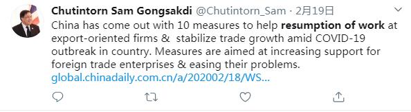 推特用戶Chutintorn Sam Gongsakdi說:在應(yīng)對新冠肺炎疫情期間,中國出臺了10項(xiàng)措施來幫助出口企業(yè)復(fù)工復(fù)產(chǎn),并推動(dòng)貿(mào)易的穩(wěn)定增長。這些措施旨在加強(qiáng)對外貿(mào)企業(yè)的支持,并解決它們面臨的問題。