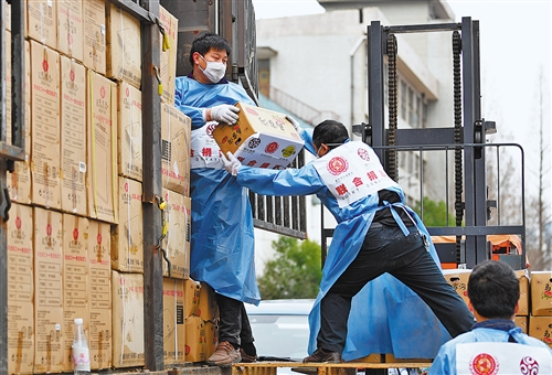 3月3日,武漢市青山區(qū)武糧倉庫,志愿者在搬運捐贈的水果等物資。記者 高興貴攝