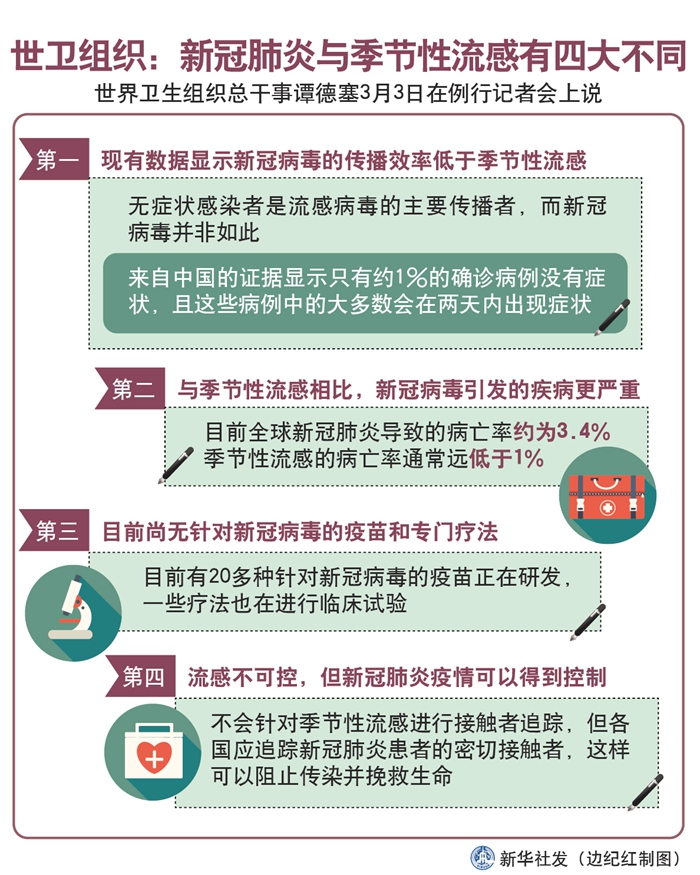 世界衛(wèi)生組織總干事譚德塞3日在例行記者會(huì)上說,世衛(wèi)組織正在加深對(duì)新冠肺炎的認(rèn)識(shí),并發(fā)現(xiàn)它與季節(jié)性流感存在4個(gè)重要區(qū)別。
