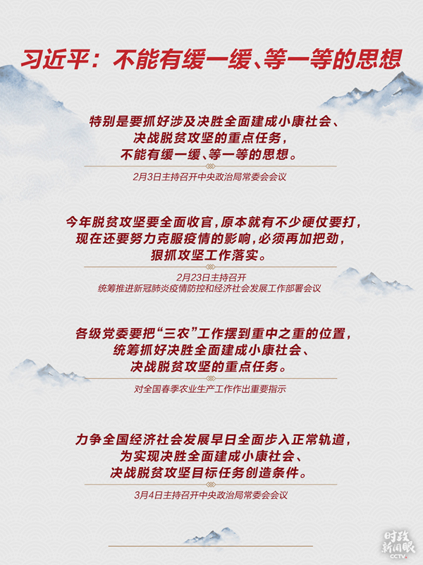 前6場座談會,都是習近平在貧困地區(qū)調(diào)研之后召開的,每次圍繞一個主題。總書記在6日的會上說,今年疫情發(fā)生后,也考慮過等疫情得到有效控制后再到地方去開,但又覺得今年滿打滿算還有不到10個月的時間,按日子算就是300天,“必須盡早再動員、再部署”。