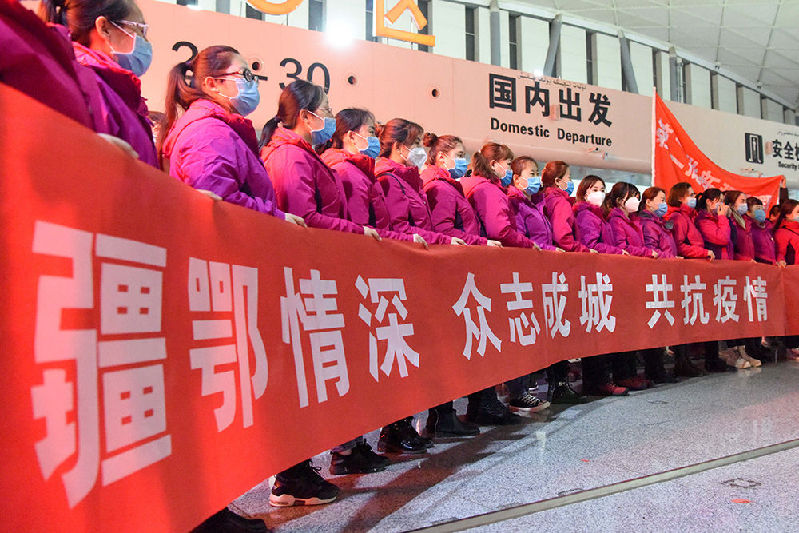新疆第二批支援湖北醫(yī)療隊隊員在出征儀式上(2020年2月4日攝)。記者 丁磊 攝