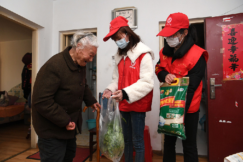 2020年3月5日,“00后”志愿者王束佳(中)和同伴為行動不便的老人送去蔬菜、大米。記者 劉軍喜 攝