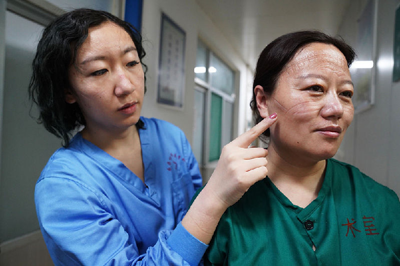 2020年1月28日,在山東省鄒平市人民醫(yī)院,醫(yī)護人員彭美麗(右)和鞏曉君把防護服脫掉后,臉上留下很深的勒痕。新華社發(fā)(董乃德攝)